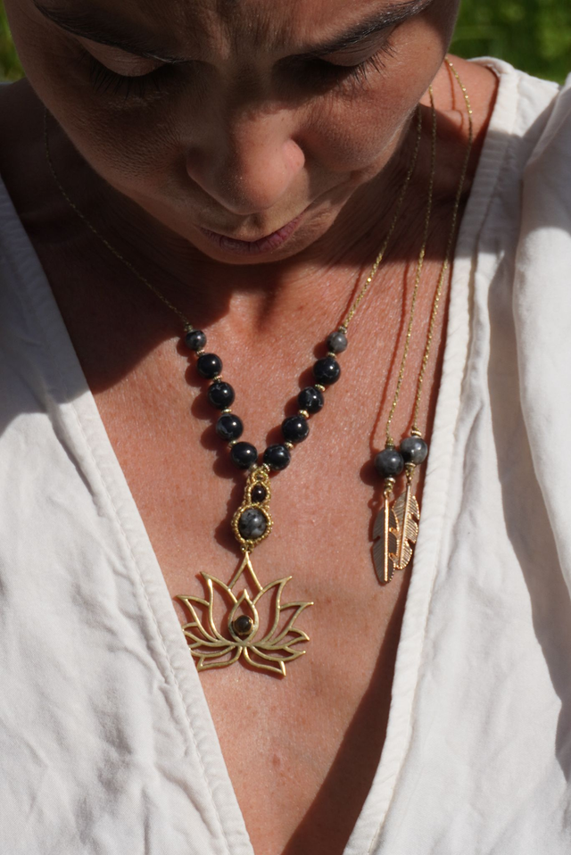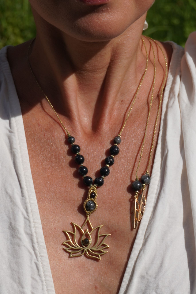 Le collier LOTUS NOIR est créé autour de pierres d'Obsidienne Flocon de neige. Il est monté autour du symbole du lotus, avec une petite labradorite au centre.